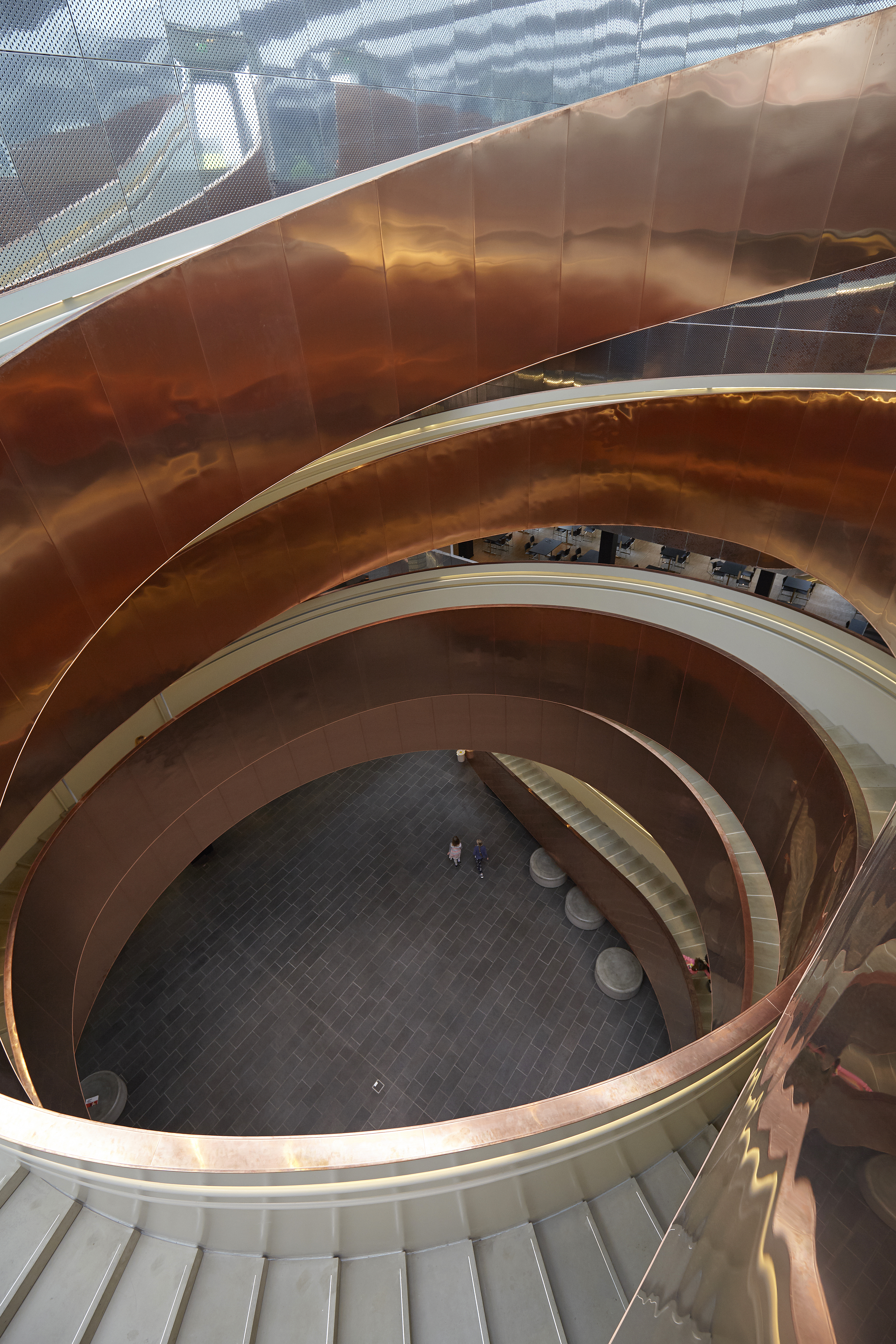 The impressive stairway was designed by CEBRA Architecture and constructed by CSK Stålindustri A/S. AE Stålmontage A/S was in charge of the copper cladding. The stairway is clad with approximately 10 ton TECU Classic copper (thickness 0.7 mm). Together the expressive surface of the copper and the design of this new stairway give a fascinating and spectacular expression, which greets the visitors when they first enter the building.