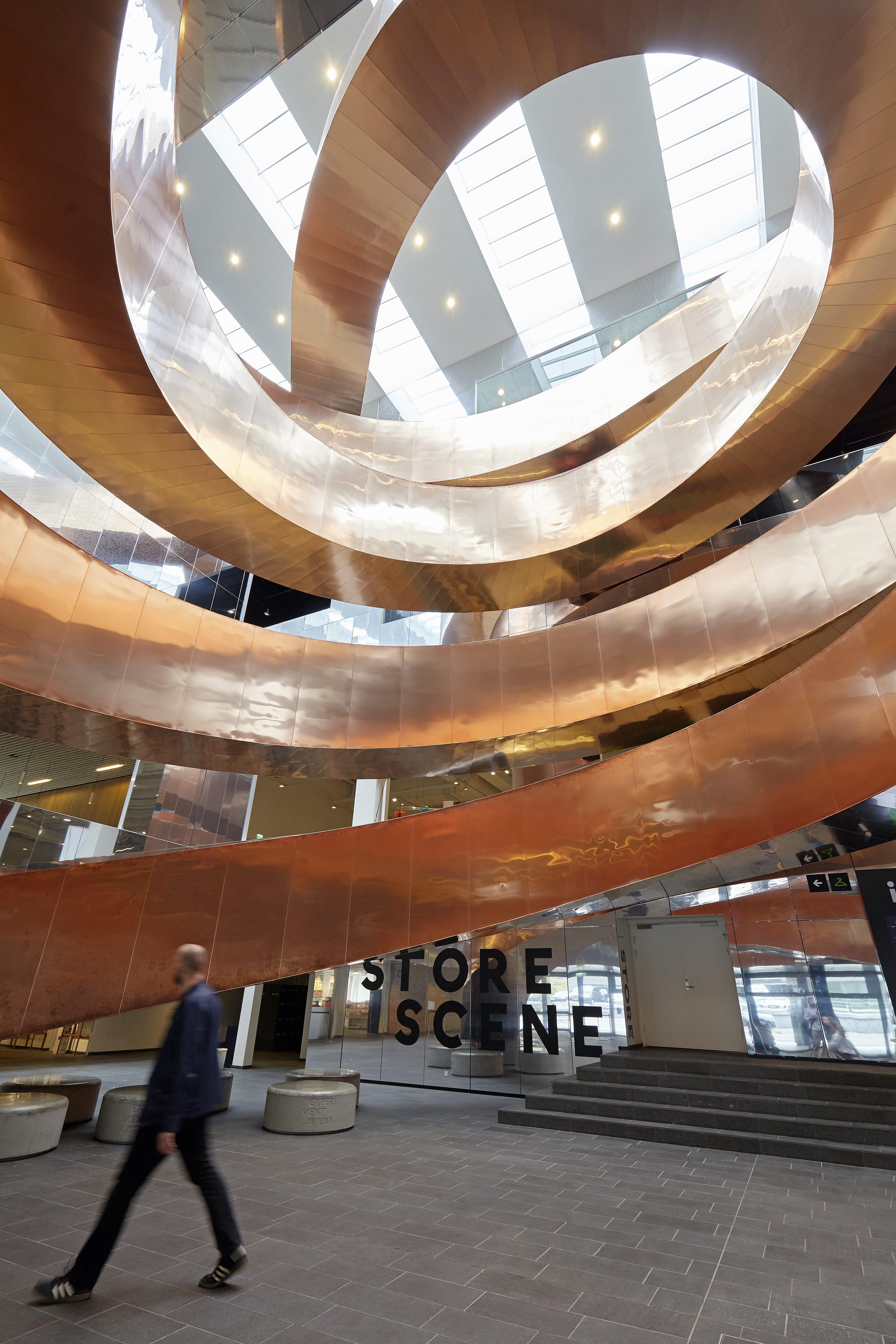 As a central part of the architecture of the renovated building stands an enormous steel stairway clad with copper. It reaches from the ground floor towards all four levels of the building. The helix shaped stairway leads the mind to strands of DNA. It is not only vital to the infrastructure of the building, but it also emphasizes that the universe of science is the starting point of the many adventures Experimentarium has to offer.